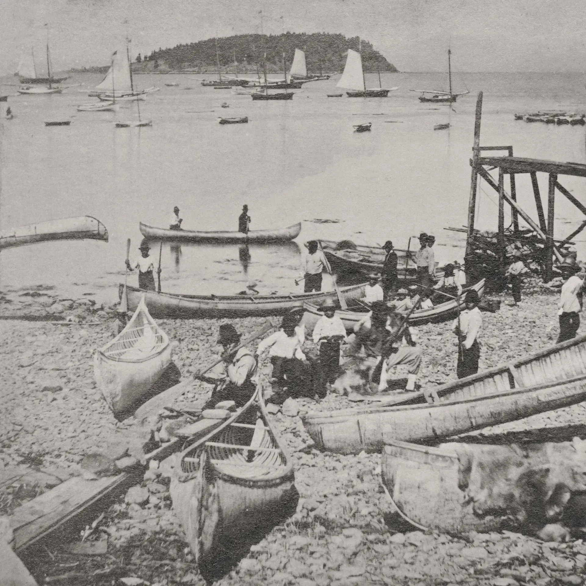 Wabanaki guides with birch bark canoes and guns wait for sport hunters and sightseers at the Bar Harbor shore.