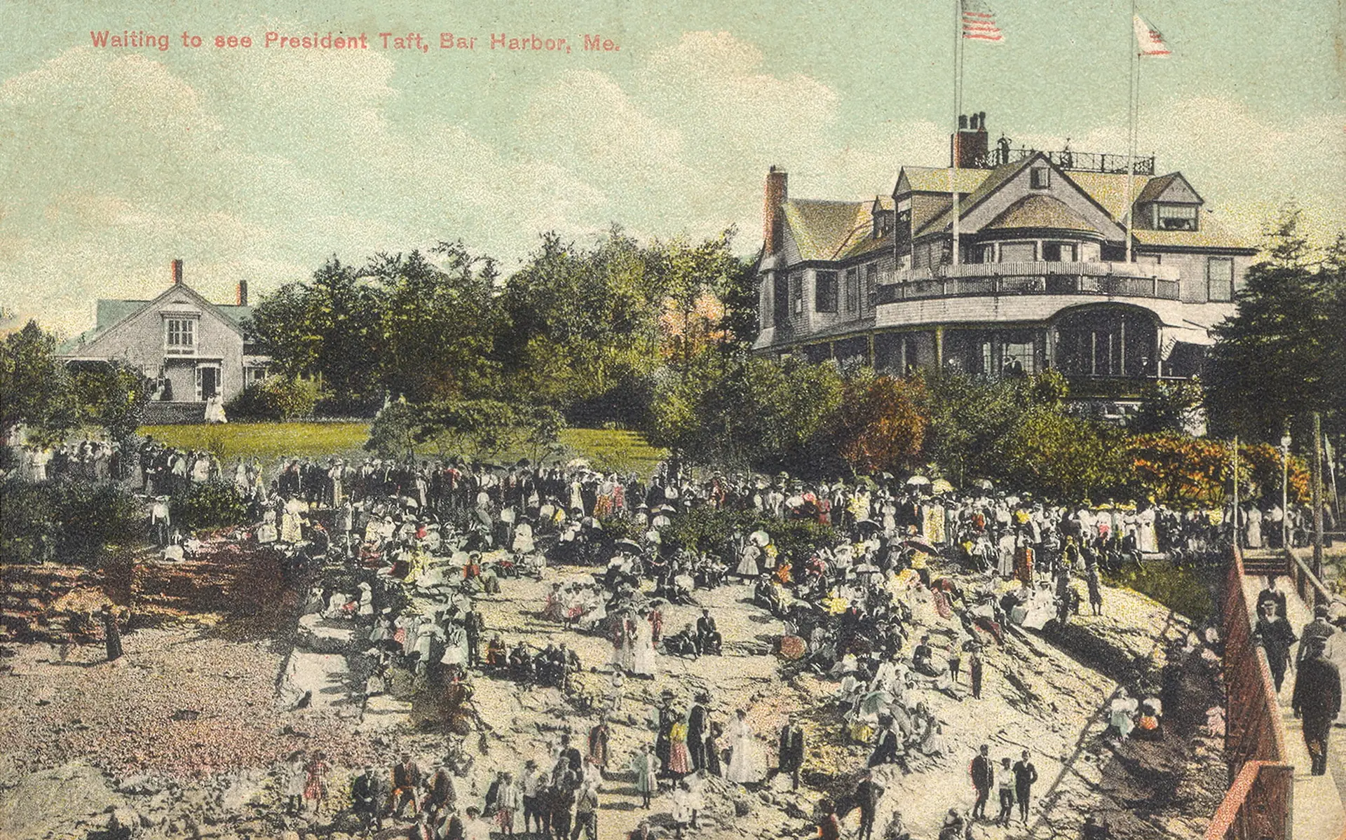 A crowd of locals and summer people gathered at the Mount Desert Reading Room to welcome President Taft to Bar Harbor.